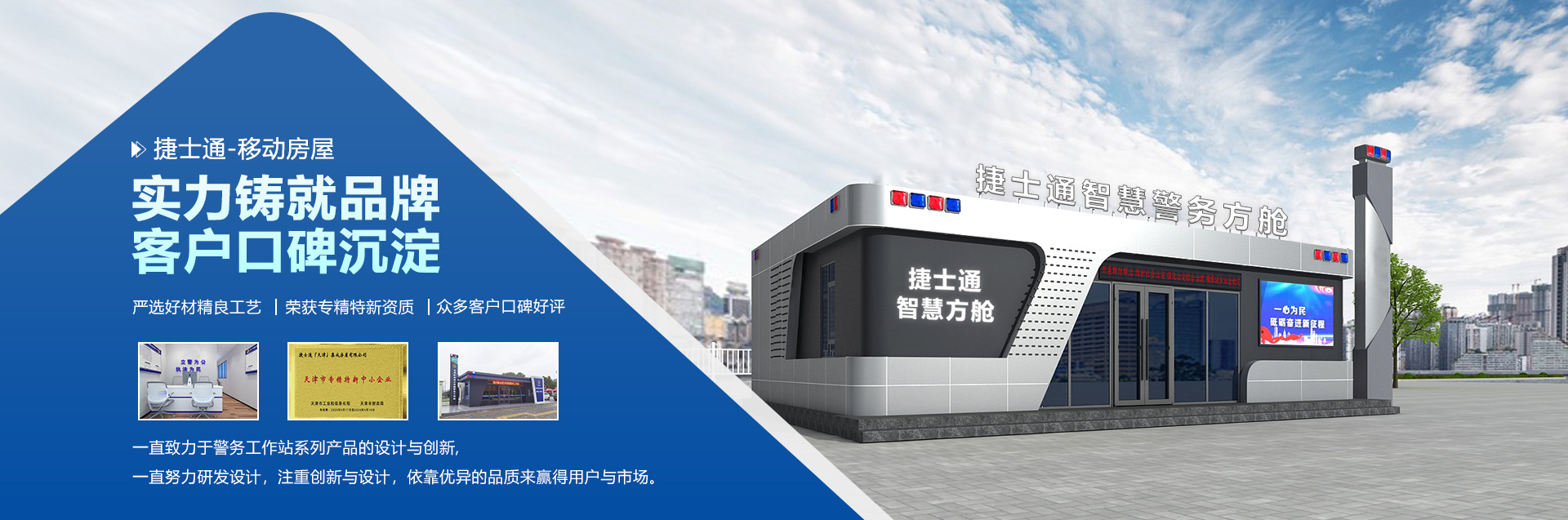 捷士通(天津)房屋智能制造有限公司是集數(shù)字化設(shè)計(jì)、智能制造、營(yíng)銷(xiāo)、服務(wù)的智慧警務(wù)工作站一體化解決方案提供商。公司成立于2006年,通過(guò)持續(xù)的行業(yè)經(jīng)驗(yàn)積累和技術(shù)創(chuàng)新,形成以軍警、環(huán)衛(wèi)、商業(yè)、文旅、鄉(xiāng)村振興五大領(lǐng)域,不斷開(kāi)拓智慧警務(wù)工作站、交通警務(wù)站、移動(dòng)警務(wù)室、警務(wù)檢查站、綜合執(zhí)法站等業(yè)務(wù)板塊,通過(guò)了1S09001體系認(rèn)證,擁有強(qiáng)大的鋼結(jié)構(gòu)裝配式房屋技術(shù)團(tuán)隊(duì),不斷進(jìn)行創(chuàng)新驅(qū)動(dòng)和轉(zhuǎn)型升級(jí),在大型移動(dòng)房屋領(lǐng)域擁有60多項(xiàng)關(guān)鍵技術(shù)。公司堅(jiān)持低碳發(fā)展,智造未來(lái)的理念。通過(guò)數(shù)字化設(shè)計(jì)實(shí)現(xiàn)定制化需求,裝配式達(dá)到國(guó)家AAA級(jí)標(biāo)準(zhǔn), 發(fā)展成為AAA級(jí)信用企業(yè),天津市雛鷹企業(yè),國(guó)家高新技術(shù)企業(yè)。公司以客戶(hù)為中心,為客戶(hù)提供“捷士通式服務(wù)體系”,成為全國(guó)智慧警務(wù)工作站一體化解決方案提供商。
